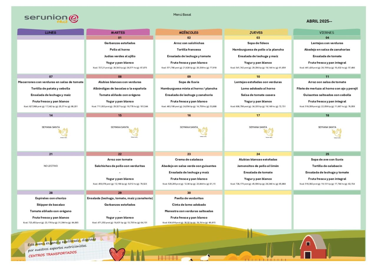 En esta página recogeremos la información relativa al servicio de comedor escolar. Novedades MENÚ COMEDOR JUNIO Raquel Romero Soltero 28 de mayo de 2025 Leer más MENÚ COMEDOR MAYO Raquel Romero Soltero 4 de mayo de 2025 Leer más MENÚ COMEDOR ABRIL Raquel Romero Soltero 1 de abril de 2025 Leer más MENÚ COMEDOR MARZO 7 de marzo de 2025 Leer más MENÚ COMEDOR FEBRERO Raquel Romero Soltero 17 de febrero de 2025 MENÚ FEBRERO Leer más MENÚ COMEDOR ENERO Raquel Romero Soltero 9 de enero de 2025 Menú enero Leer más